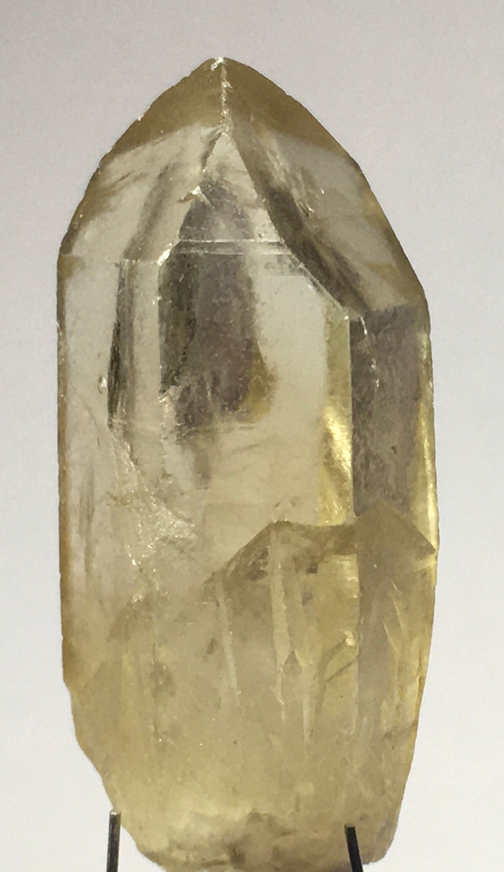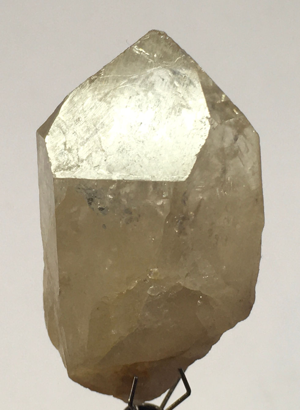 Right: A rare fenster/window quartz with thinly layered clay inclusions, gas inclusions and a fluid inclusion with moving Bubble. Optical clarity. Golden smokey hues. 2.6gm